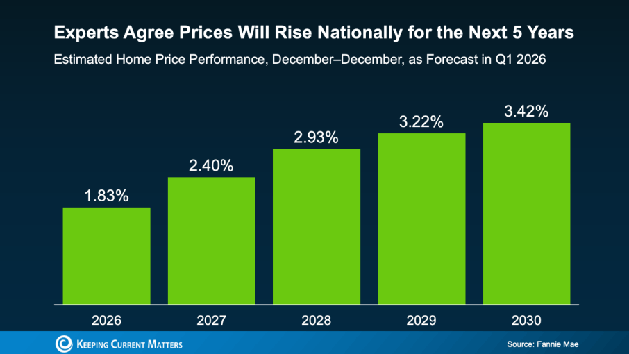 In fact, Fannie Mae surveyed over 100 housing market experts to ask their opinions on where prices are headed from here. And the experts agree, nationally, prices are expected to keep rising over the next five years: